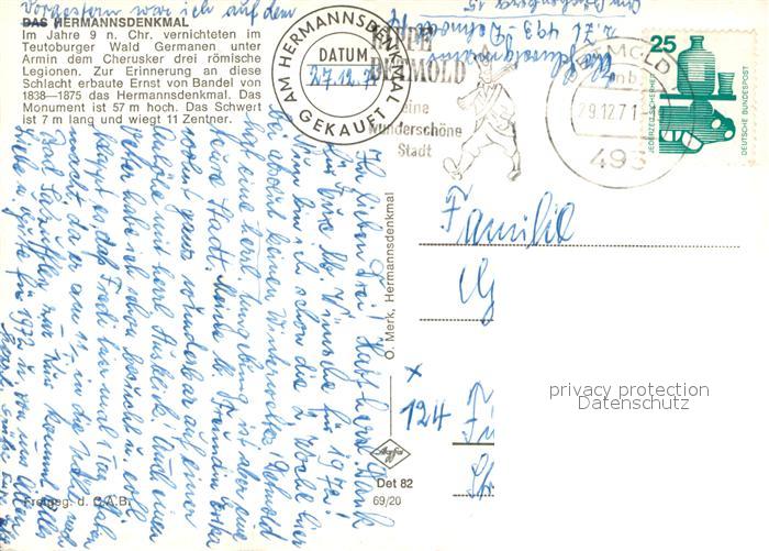 73737438 alte Postkarte Detmold HErmannsdenkmal postalisch gelaufen Erhaltung siehe scans [LiesaD40] KatCode: 11110005766020