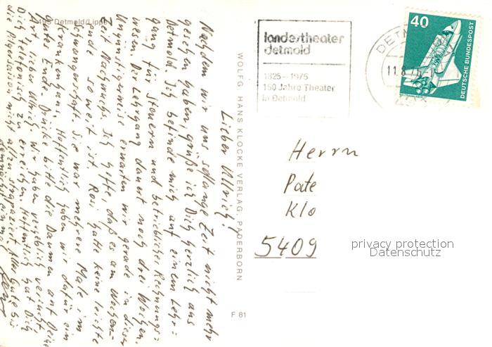 72943785 alte Postkarte Detmold Schloss Rathaus Hermannsdenkmal Musikakademie Landestheater postalisch gelaufen Erhaltung siehe scans [PaolaD17] KatCode: 11110005766020