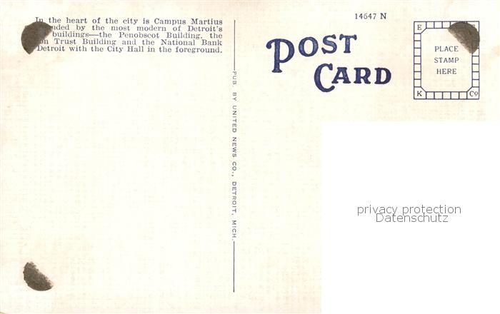 73819363 old postcard Detroit Michigan City Campus Martius postalisch gelaufen Erhaltung siehe scans [FriedD77] KatCode: 14140240000000