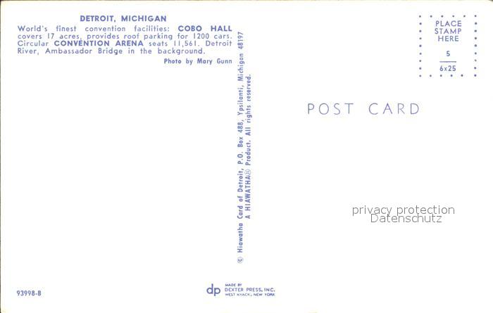 72167318 Detroit Michigan Cobo Hall Convention Arena Detroit River Ambassador Bridge postalisch nicht gelaufen Erhaltung siehe scans KatCode: 14140240000000