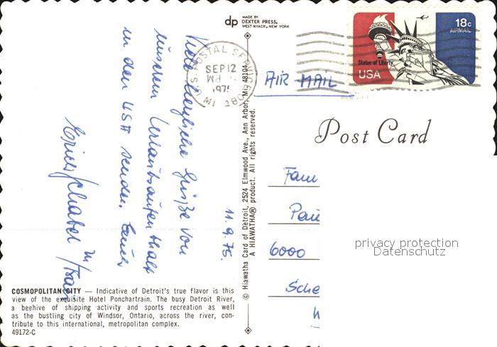 72493725 old postcard Detroit Michigan Cosmopolitan City Hotel Ponchartrain Detroit River Windsor Ontario across the river aerial view postalisch gelaufen Erhaltung siehe scans KatCode: 14140240000000