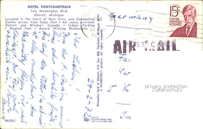 72415821 old postcard Detroit Michigan Hotel Pontchartrain Fliegeraufnahme postalisch gelaufen Erhaltung siehe scans KatCode: 14140240000000
