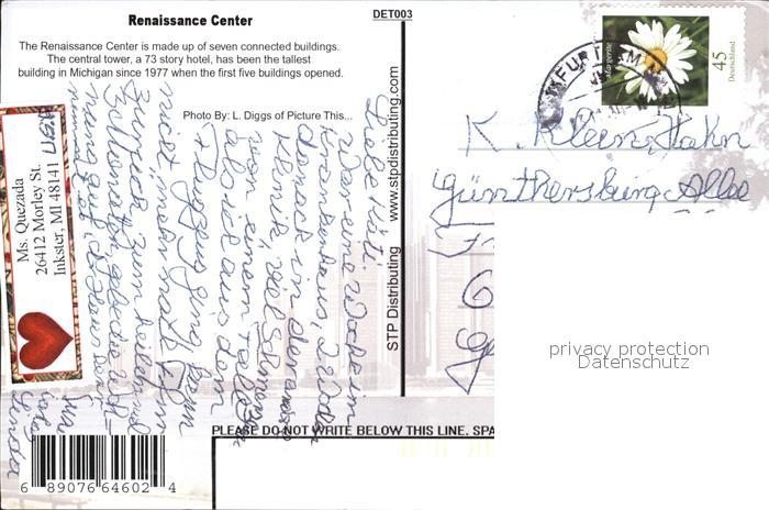72445847 old postcard Detroit Michigan Renaissance Center postalisch gelaufen Erhaltung siehe scans KatCode: 14140240000000