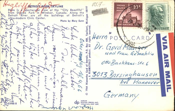 11491780 old postcard Detroit Michigan River Skyline Civic Center Dieppe Park Windsor postalisch gelaufen Erhaltung siehe scans KatCode: 14140240000000