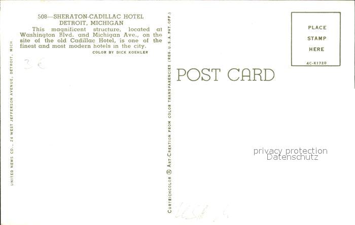 71954749 Detroit Michigan Sheraton Cadillac Hotel postalisch nicht gelaufen Erhaltung siehe scans KatCode: 14140240000000