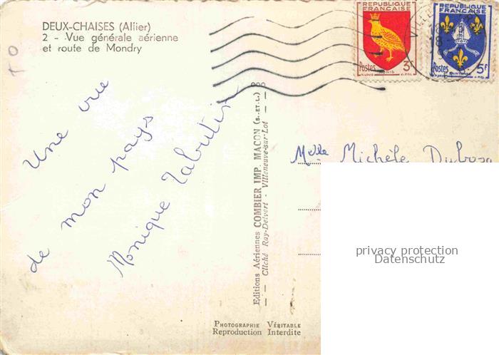 34146230 carte postale Deux-Chaises MOULINS 03 Allier Vue générale aérienne et Route de Mondry postalisch gelaufen Fliegeraufnahme Erhaltung siehe scans [FriedD77] KatCode: 11170003203099