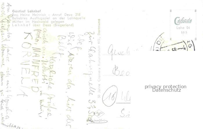 74055251 alte Postkarte Deuz Netphen Siegen-Wittgenstein NRW Forsthaus Lahnhof postalisch gelaufen Erhaltung siehe scans [FriedD77] KatCode: 11110005970032
