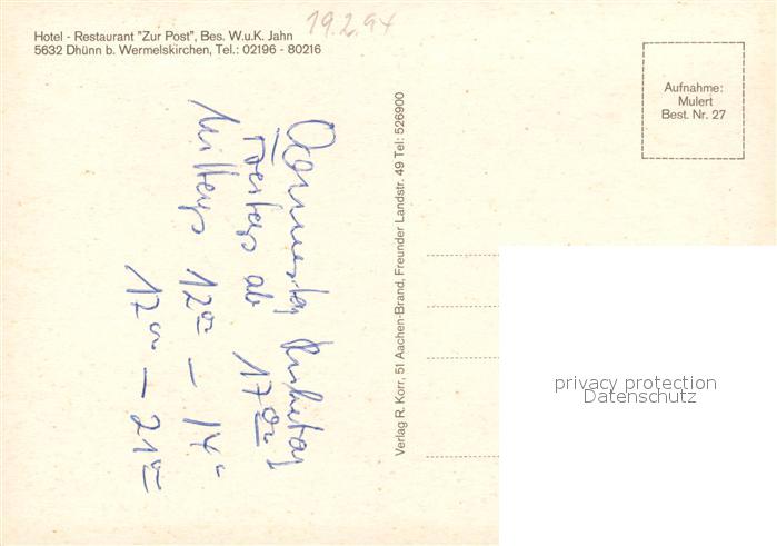 73174799 Dhuenn Wermelskirchen Hotel Zur Post postalisch nicht gelaufen Erhaltung siehe scans [NatalD47] KatCode: 11110005378032