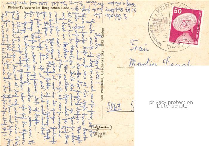 73030278 alte Postkarte Dhuenn Wipperfuerth Talsperre im Bergischen Land postalisch gelaufen Erhaltung siehe scans [WerneD78] KatCode: 11110005374052