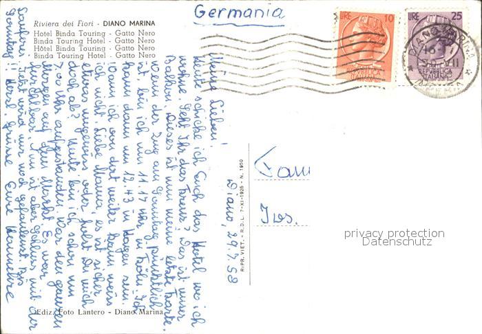 old postcard Diano Marina Hotel Binda Touring Gatto Nero Riviera dei Fiori postalisch gelaufen Erhaltung siehe scans