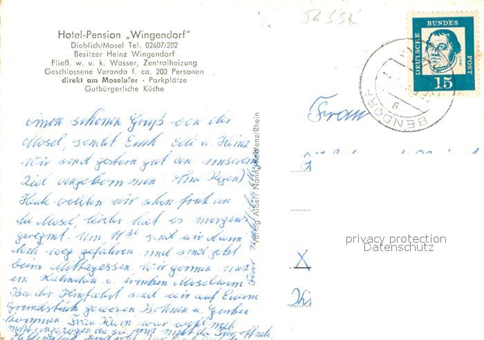 73653996 alte Postkarte Dieblich Hotel Pension Wingendorf Kirche Terrasse Gastraum postalisch gelaufen Erhaltung siehe scans [WerneD78] KatCode: 11110007137207