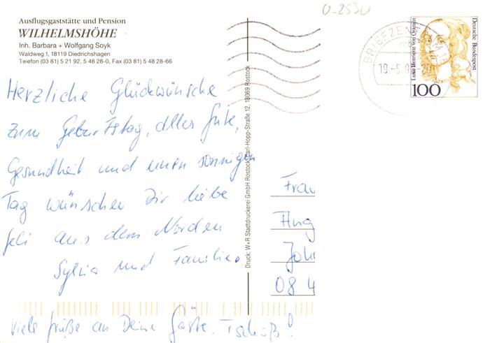 73947187 alte Postkarte Diedrichshagen Greifswald Gaststaette Pension Wilhelmshoehe postalisch gelaufen Erhaltung siehe scans [WerneD78] KatCode: 11110013059019