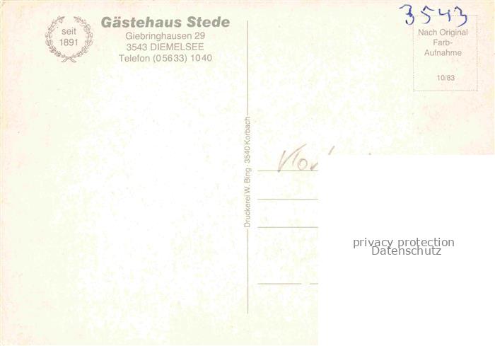 74085066 Diemelsee Hessen Gaestehaus Stede postalisch nicht gelaufen Erhaltung siehe scans [WerneD78] KatCode: 11110006635007