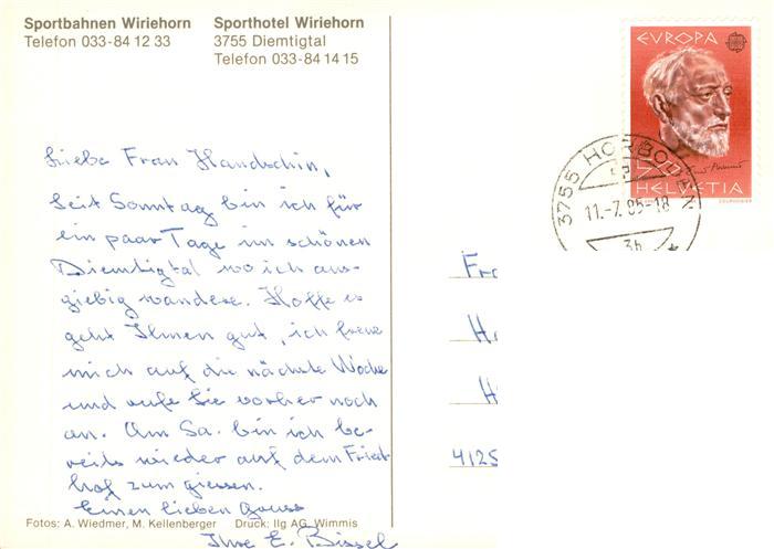 13901478 alte Postkarte Diemtigtal BE Sporthotel Sportbahnen Wiriehorn Tennisplaetze Ponyreiten Sessellift postalisch gelaufen Erhaltung siehe scans [FriedD77] KatCode: 11470060205536