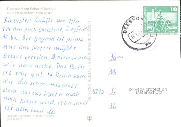 72002972 alte Postkarte Diensdorf-Radlow Scharmuetzelsee FDGB Erholungsheim Franz Kirsch postalisch gelaufen Erhaltung siehe scans KatCode: 11110012067112