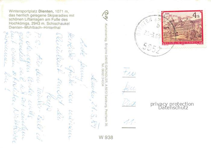 74138865 alte Postkarte Dienten Hochkoenig Pinzgau-Pongau AT Panorama Skiabfahrt Ortsmotiv Eingang postalisch gelaufen Erhaltung siehe scans [WerneD78] KatCode: 11390322050603