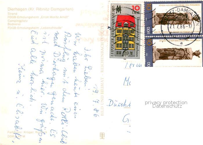 73813965 alte Postkarte Dierhagen Ostseebad Strand FDGB Erholungsheim Ernst Moritz Arndt Campingplatz Buendnerei FDGB Erholungsheim Lebensfreude postalisch gelaufen Erhaltung siehe scans [WerneD78] KatCode: 11110013057022