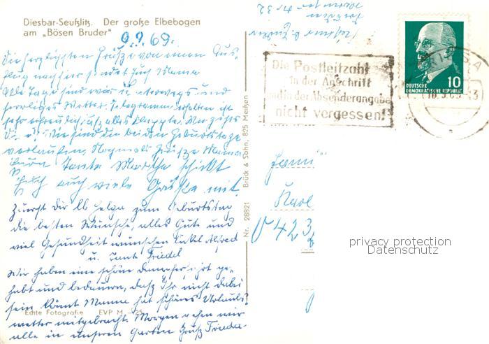 73832735 alte Postkarte Diesbar-Seusslitz Grosser Elbebogen am Boesen Bruder Fahrgastschiff postalisch gelaufen Erhaltung siehe scans [FriedD77] KatCode: 11110014285190