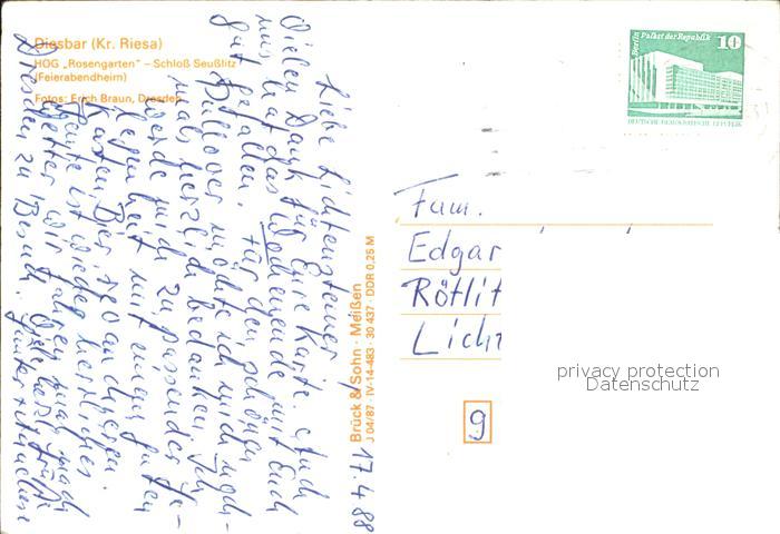 72396826 alte Postkarte Diesbar-Seusslitz HOG Rosengarten Schloss Seusslitz postalisch gelaufen Erhaltung siehe scans KatCode: 11110014285190