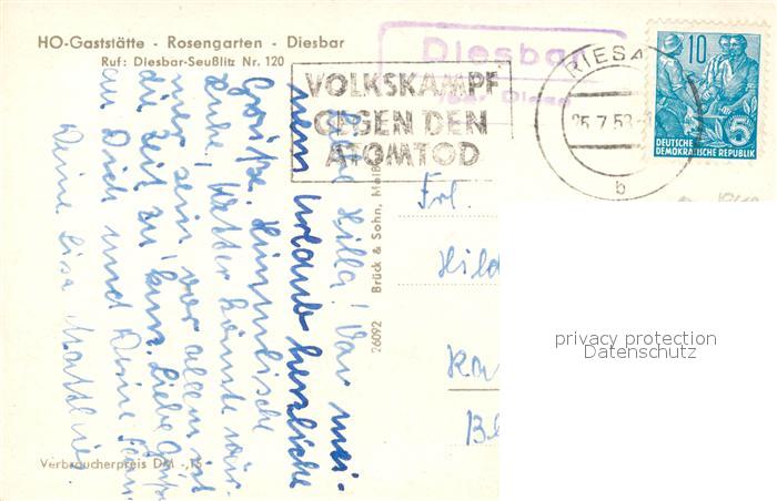 43361232 alte Postkarte Diesbar-Seusslitz Partie an der Elbe HO Gaststaette Rosengarten postalisch gelaufen Erhaltung siehe scans [WerneD78] KatCode: 11110014285190