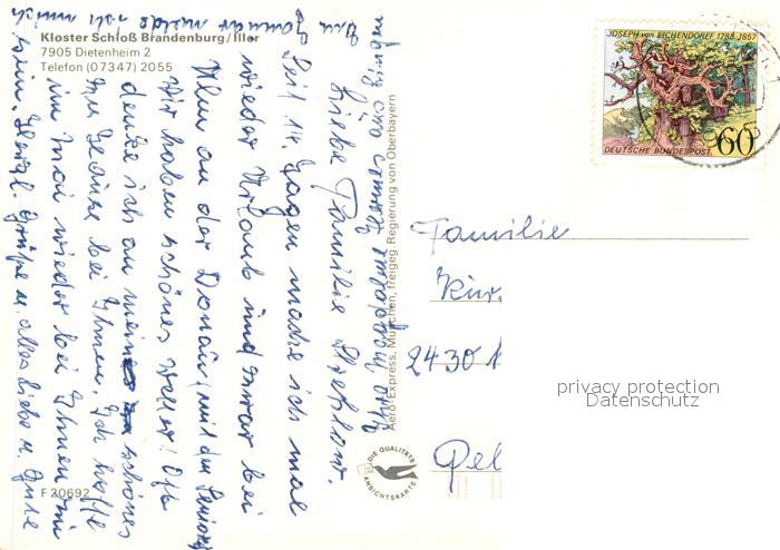 73121744 alte Postkarte Dietenheim Iller FliegeraufnahmeKloster Schloss Brandenburg postalisch gelaufen Erhaltung siehe scans [KathaD81] KatCode: 11110008425028