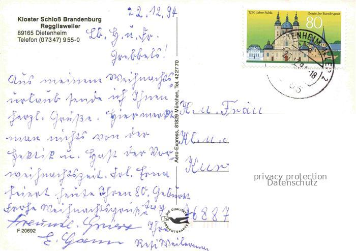 74023867 alte Postkarte Dietenheim Iller Kloster Schloss Brandenburg Regglisweiler postalisch gelaufen Fliegeraufnahme Erhaltung siehe scans [FriedD77] KatCode: 11110008425028