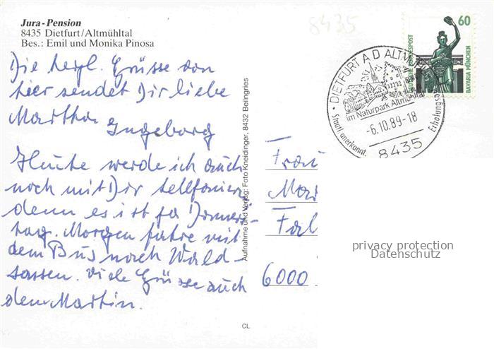 74049096 alte Postkarte Dietfurt Altmuehl Jura-Pension Gasraum Stadtpanorama Freibad postalisch gelaufen Erhaltung siehe scans [FriedD77] KatCode: 11110009373121