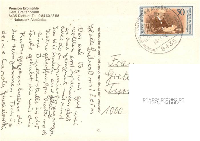 73767608 alte Postkarte Dietfurt Altmuehl Pension Erbmuehle Panorama postalisch gelaufen Erhaltung siehe scans [FriedD77] KatCode: 11110009373121
