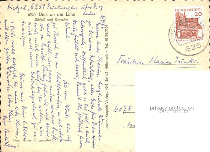 72432609 alte Postkarte Diez Lahn Schloss Rezeptur postalisch gelaufen Erhaltung siehe scans KatCode: 11110007141029