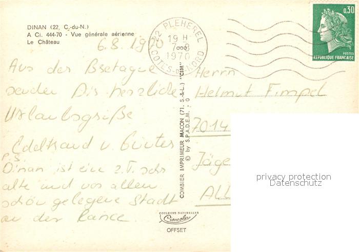 13240815 carte postale Dinan 22 Fliegeraufnahme Chateau postalisch gelaufen Erhaltung siehe scans [LiesaD40] KatCode: 11170022122050