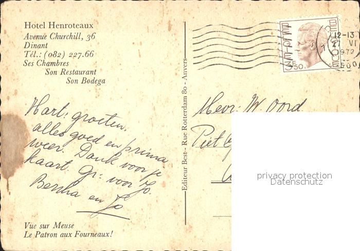 72293337 carte postale Dinant Wallonie Hotel Henroteaux postalisch gelaufen Erhaltung siehe scans KatCode: 11070091000132