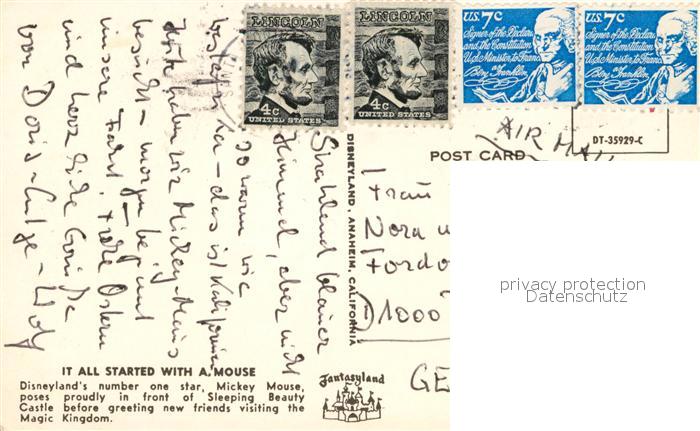 72908433 old postcard Disneyland California Mickey Mouse Beauty Castle postalisch gelaufen Erhaltung siehe scans [PaolaD17] KatCode: 14140110000000