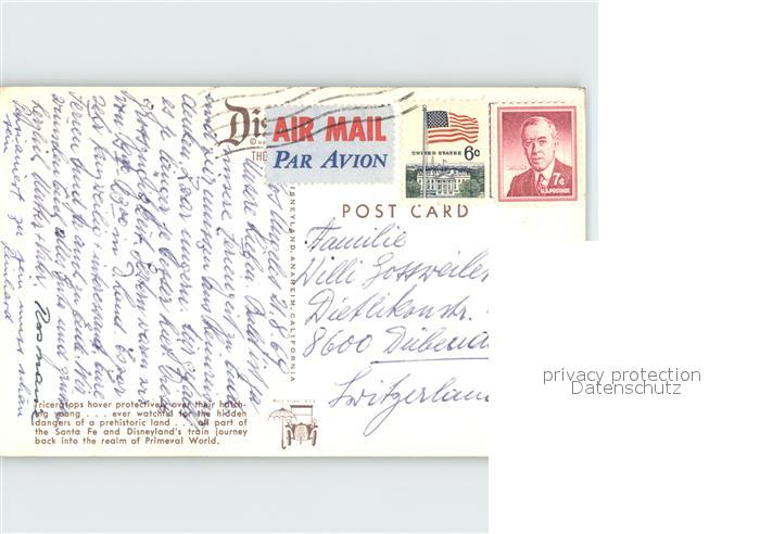 12220986 old postcard Disneyland California Primeval World Triceratops postalisch gelaufen Erhaltung siehe scans KatCode: 14140110000000