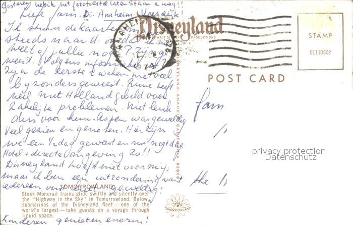 72303437 old postcard Disneyland California Tomorrow Land Sleek Monorail Train Submarine postalisch gelaufen Erhaltung siehe scans KatCode: 14140110000000