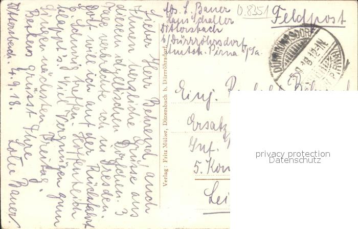 42248676 alte Postkarte Dittersbach Duerrroehrsdorf Ortsansicht postalisch gelaufen Feldpost Erhaltung siehe scans KatCode: 11110014287110