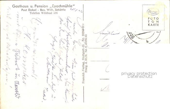71917259 alte Postkarte Dobel Schwarzwald Eyachmuehle Gasthaus Pension postalisch gelaufen Erhaltung siehe scans KatCode: 11110008235018