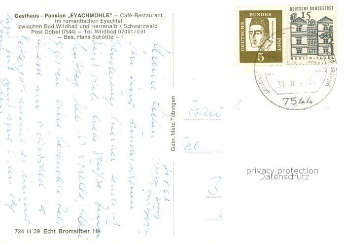 73654172 alte Postkarte Dobel Schwarzwald Gasthaus Pension Eyachmuehle Cafe Restaurant im Eyachtal postalisch gelaufen Erhaltung siehe scans [FriedD77] KatCode: 11110008235018