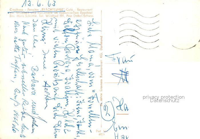 73254836 alte Postkarte Dobel Schwarzwald Gasthaus Pension Eyachmuehle im Eyachtal postalisch gelaufen Erhaltung siehe scans [FriedD77] KatCode: 11110008235018