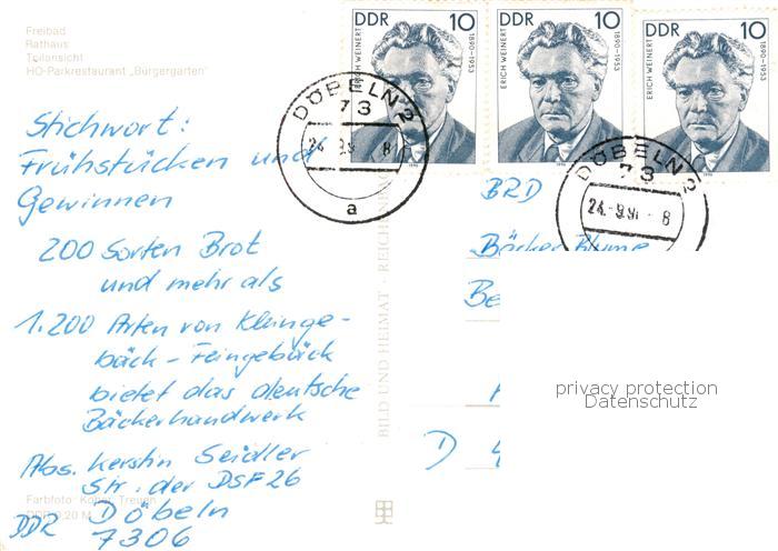 73812848 alte Postkarte Doebeln Freibad Rathaus Panorama HO Parkrestaurant Buergergarten postalisch gelaufen Erhaltung siehe scans [WerneD78] KatCode: 11110014375030