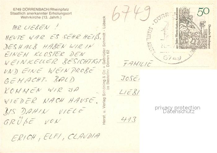 73257520 alte Postkarte Doerrenbach Wehrkirche 13. Jhdt. postalisch gelaufen Erhaltung siehe scans [FriedD77] KatCode: 11110007337005