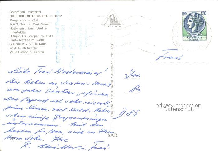 old postcard Dolomiten Pustertal Drei Schusterhuette Section Drei Zinnen postalisch gelaufen Erhaltung siehe scans