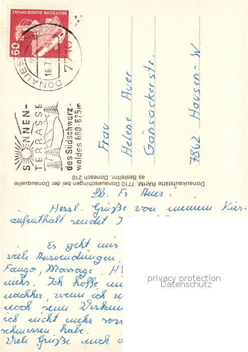 73336641 alte Postkarte Donaueschingen Fliegeraufnahme Fachklinik Sonnhalde Rathaus Irmabrunnen Stadtmitte postalisch gelaufen Erhaltung siehe scans [WerneD78] KatCode: 11110008326012