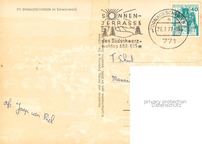 73689338 alte Postkarte Donaueschingen im Schwarzwald Fliegeraufnahme postalisch gelaufen Erhaltung siehe scans [FriedD77] KatCode: 11110008326012
