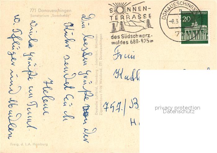 73321665 alte Postkarte Donaueschingen Sanatorium Sonnhalde Fliegeraufnahme postalisch gelaufen Erhaltung siehe scans [WerneD78] KatCode: 11110008326012
