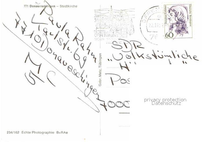 72797259 alte Postkarte Donaueschingen Stadtkirche postalisch gelaufen Erhaltung siehe scans [AndreD76] KatCode: 11110008326012