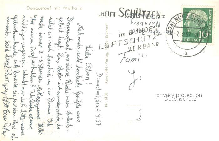 73646739 alte Postkarte Donaustauf Fliegeraufnahme mit Walhalla postalisch gelaufen Erhaltung siehe scans [WerneD78] KatCode: 11110009375130