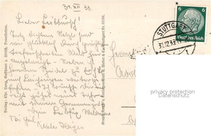 32980292 alte Postkarte Donnstetten Roemerstein Gasthaus Hirsch postalisch gelaufen Erhaltung siehe scans [NatalD47] KatCode: 11110008415088