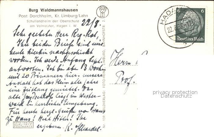 72126353 alte Postkarte Dorchheim Limburg Lahn Burg Waldmannshausen postalisch gelaufen Erhaltung siehe scans KatCode: 11110006533005