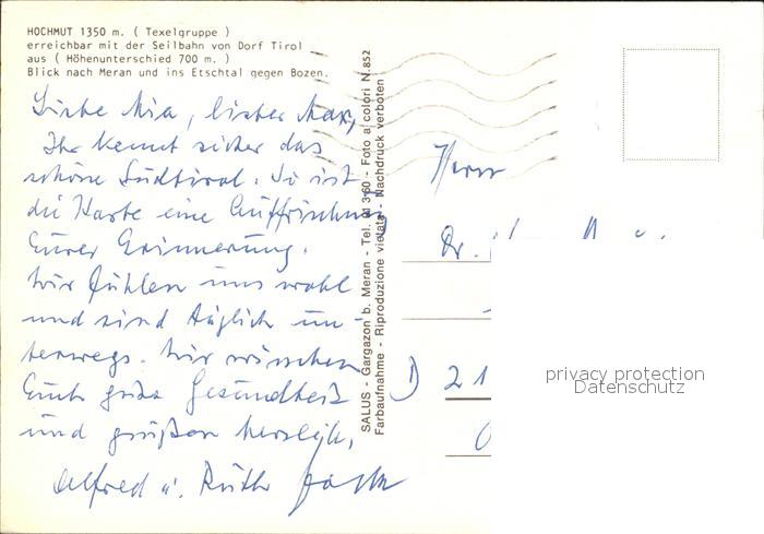 Dorf Tirol Gasthof Hochmut Terrasse mit Blick nach Meran und Etschtal Fliegeraufnahme postalisch nicht gelaufen Erhaltung siehe scans