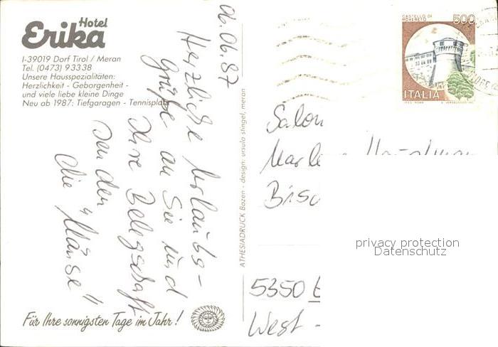 old postcard Dorf Tirol Hotel Erika postalisch gelaufen Erhaltung siehe scans